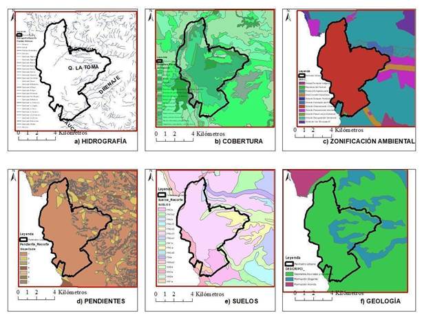 Mapas dentro del área de estudio. Los mapas muestran la hidrografía (a), uso del suelo (b), zonificación ambiental (c), pendientes (d), suelos (e)y geología (f). La línea negra indica el perímetro urbano de la ciudad de Neiva.