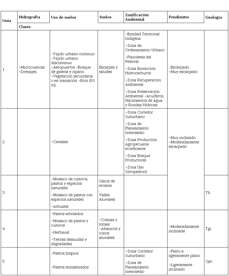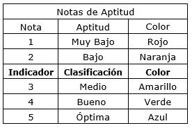 La nota otorgada puede ser 1, 2, 3, 4 o 5 representando “Muy bajo”, “Bajo”, “Medio”, “Bueno” u “Óptima” respectivamente. Por ejemplo, si la zona es apta para urbanización entonces recibirá una nota de 5. De igual forma, se otorgó un color para cada zona basado en su nota de actitud, dichos colores fueron rojo (1), naranja (2), amarillo (3), verde (4) y azul (5).
