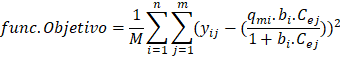 La Función objetivo propuesta se muestra en la ecuación (10). Representa el error cuadrático medio entre los datos y la salida de las isotermas de Langmuir para cada temperatura.