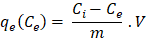 (1)Siendo Ci [ppm] y Ce [ppm] la concentración de cromo hexavalente inicial y en el equilibrio respectivamente, m [g] es la masa de carbón activado, V [L] es el volumen de la solución y qe [mg.g-1] es la capacidad de adsorción.