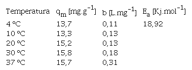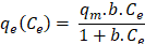 (2)donde: qe [mg.g-1] es la capacidad de adsorción, qm [mg.g-1] es la capacidad de adsorción máxima de mono capa, b [L.mg-1] es la constante de equilibrio y Ce [ppm] es la concentración de equilibrio del adsobato. La constante b es única para una temperatura determinada, su variación respecto a la temperatura responde a la ecuación de Arrhenius: