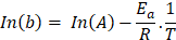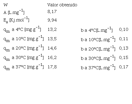 (3)donde: A [L.mg-1] es el factor pre exponencial, Ea [Kj.mol-1]es la energía de activación, R es la constante universal de los gases [Kj.mol-1] y T [K] es la temperatura absoluta.
