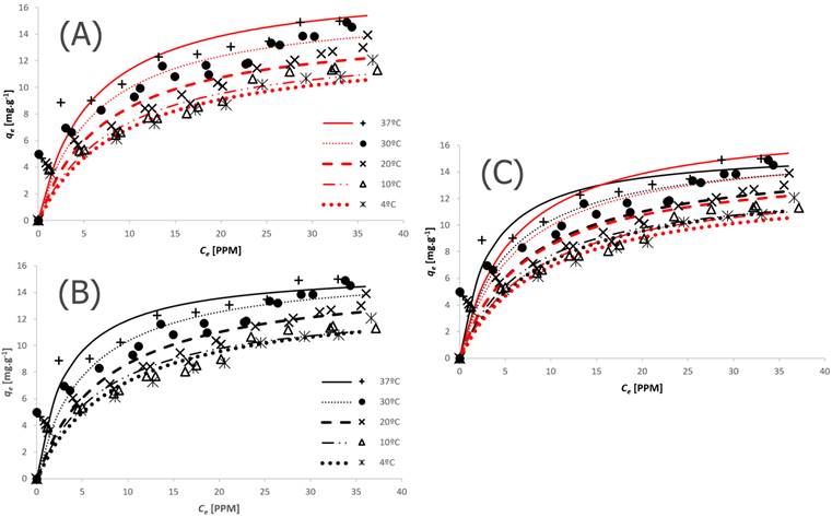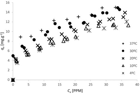 Los resultados experimentales para las distintas isotermas de equilibrio obtenidas se muestran en la Figura 1, los experimentos fueron realizados a las temperaturas de 4, 10, 20, 30 y 37ºC.