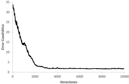 Una vez aplicado el algoritmo optimizador, se observa en la Figura 2, la evolución del error cuadrático medio en función de las iteraciones. Se empleó una temperatura inicial de 1000 con un tamaño de paso de 0,05.