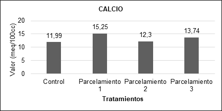 De acuerdo a la gráfica 15 los niveles de calcio en términos generales subieron en comparación con el de control el cual dio 11,99 lo significa que el suelo tiene niveles medios de calcio, según la tabla de parámetro (ver anexo 14) en cambio los parcelamientos 1, 2 y 3 dieron valores de 15,25 meq/100cc, 12,3 meq/100cc y 13,74 meq/100cc respectivamente, lo que quiere decir que el suelo posee niveles altos de calcio después de ser aplicado el tratamiento. Estos niveles altos de calcio pueden deberse a la incorporación de las especies gramíneas (Maíz, pasto estrella y brachiaria) y leguminosas (Acacia y Yaguaro) ya que estas contienen una buena fuente de minerales como en ese caso el calcio.