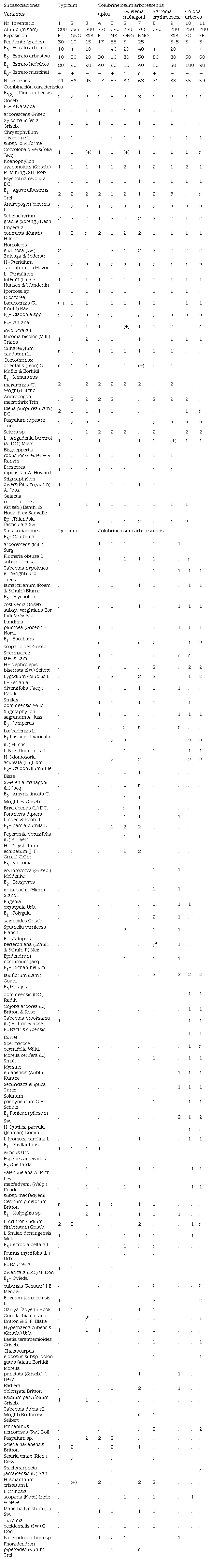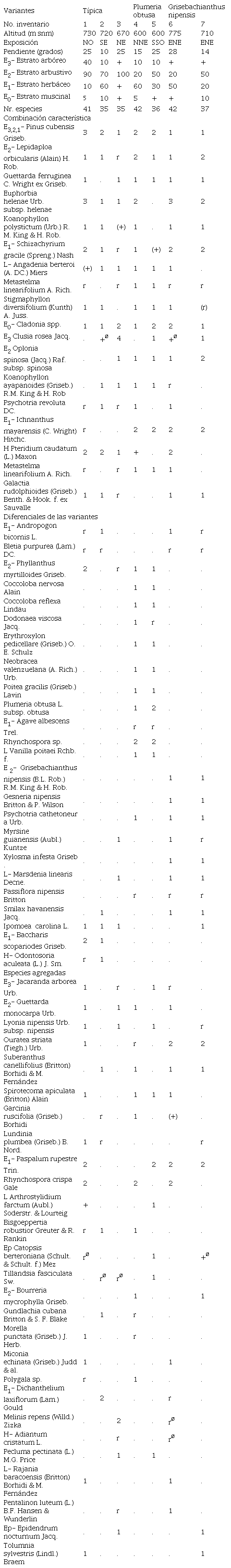 La variante típica presentó las mismas características que las descritas para la asociación; mientras. Plumeria obtusa y Grisebachianthus nipensis tuvieron claras combinaciones diferenciales (Tabla 3).
