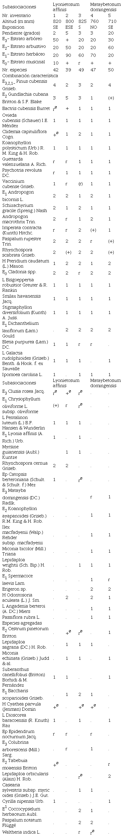 En un solo inventario de la Tabla 2. Inv. 1: Coccoloba nipensis Urb. r, Erythroxylum longipes O.E. Schulz r, Jacaranda arborea Urb. r, Linodendron cubense (A. Rich.) Griseb. r, Morella cerifera (L.) Small 1, Ouratea striata (Tiegh.) Urb. r, Vanilla poitaei Rchb. f. rø; Inv. 2: Lundinia plumbea (Griseb.) B. Nord. rø, Rhynchospora berteroi (Spreng.) C.B. Clarke r, Rhynchospora diodon (Nees) Griseb. +, Dendropemon sp. r; Inv. 3: Chaptalia media (Griseb.) Urb. r, Gordonia moaensis (Vict.) H. Keng +, Ocotea leucoxylon (Sw.) Laness. +, Hyparrhenia rufa (Nees) Stapf +, Paspalum alaini León 1, Setaria tenax (Rich.) Desv. r, Passiflora suberosa L. +; Inv. 4: Cassia sp. +, Dodonaea viscosa Jacq. r, Piper aduncum subsp. ossanum (C. DC.) Saralegui r, Orthosia scoparia (Nutt.) Liede & Meve r, Dioscorea sp. +; Inv. 5: Terminalia tetraphylla (Aubl.) Gere & Boatwr. +, Euphorbia helenae Urb. subsp. helenae rø, Prunus myrtifolia (L.) Urb. +, Rhytidophyllum exsertum Griseb. r, Chusquea abietifolia Griseb. rø, Dichanthelium aciculare (Poir.) Gould & C.A. Clark +, Panicum pilosum Sw. +, Lygodium volubile Sw. r, Smilax domingensis Willd. +, Tillandsia fasciculata Sw. rø.
