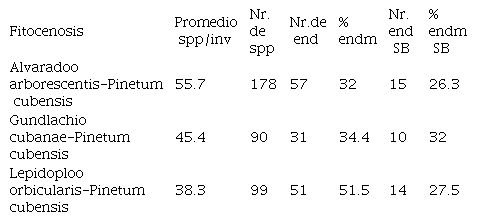 Es de enfatizar (Tabla 4), el alto endemismo de estas comunidades, destacándose Lepidoploo orbicularis-Pinetum cubensis con un 50,5 % y Gundlachio cubanae-Pinetum cubensis con 32 % de éstos estrictos de la subregión Sagua Baracoa.
