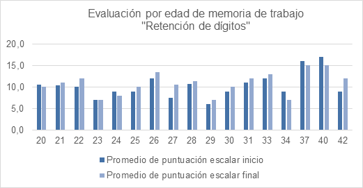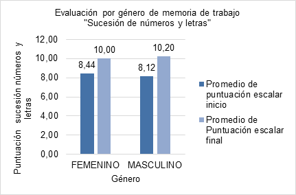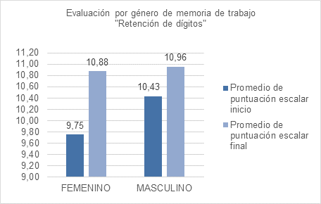 Al pasar los datos naturales a datos escalares, se obtuvo una media de 10,26 al inicio y de 10,94 al final. La media poblacional para esta subprueba es de 10, con una desviación de 3. Por lo tanto, se puede afirmar que la población se encuentra en la media. A continuación, en la figura 1 se muestra la evaluación por género del perfil de memoria de trabajo con la subprueba “Retención de dígitos”.