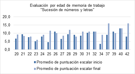 Con respecto a los cambios en el perfil de memoria de trabajo en relación con la edad y el género, se estima que el número promedio de dígitos y de letras de la prueba final no es significativamente diferente al número promedio de la prueba inicial. En otras palabras, se evidencian cambios del antes y el después en ambos géneros, al igual que en la mayoría de las edades, sin ser representativos en alguna edad en particular.