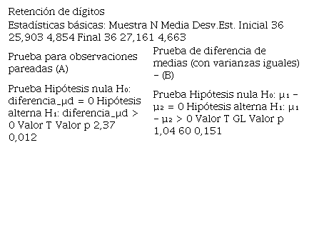 Como el valor P (0,012) < α (0,05) en la prueba para observaciones pareadas (A) de la tabla 3, se rechaza la hipótesis nula a favor de la alterna. En otras palabras, se estima que para cada sujeto el número de dígitos que repite en la prueba final es mayor que en la prueba inicial. Por otro lado, se estima que la diferencia entre el número de dígitos de la prueba al inicio y la prueba al final para cada sujeto está entre 0,2<μ_D<2,3. Es decir, se estima que como mínimo hay 0,2 palabras de diferencia entre el inicio y el final para cada sujeto. En conclusión, se considera que el número de dígitos es mayor en la prueba final que en la prueba inicial para cada participante.