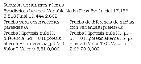 Ahora bien, como el valor P (0,002) < α (0,05) en la prueba de diferencia de medias (con varianzas iguales) (B), se rechaza la hipótesis nula a favor de la alterna. De esta forma, se estima que el número promedio de sucesiones de letras y números de la prueba al final es mayor que el número promedio de la prueba al inicio. La diferencia de los promedios de la inicial y la final está entre 0,77 < μ1-μ2 < 3,84, donde μ1 es el promedio estimado de sucesiones en la prueba final y μ2 es el promedio estimado de sucesiones en la prueba inicial. Por tanto, como mínimo hay 0,77 sucesiones de diferencia entre el promedio de la prueba final y la prueba inicial. En conclusión, se estima que el promedio del número de sucesiones de la prueba final es estadísticamente mayor que el número promedio de sucesiones de la prueba inicial.