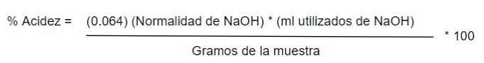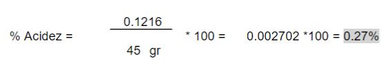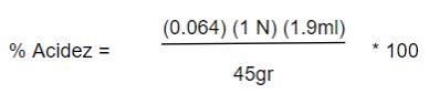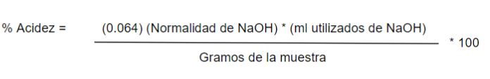 En las Figuras 13, 14 y 15 se observa el procedimiento para realizar el proceso de la titulación, primero se agregó el sobre de fenolftaleína a la muestra, se agregó el NaOH por goteo y cuando se mostró el cambio de color en la muestra, se pudo conocer la cantidad en ml de NaOH necesaria para determinar la acidez, el cálculo se realizó mediante la siguiente formula.