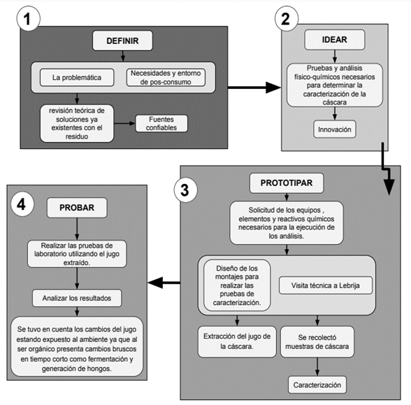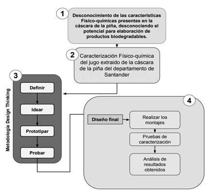 La caracterización físico-química de la cáscara de la piña se realizó en la Universidad de Santander sede Bucaramanga, en el laboratorio GAIA, dónde se encuentran los equipos necesarios y calibrados para realizar las tomas. El trabajo se desarrolló bajo la metodología design thinking, centrándose en la recopilación de información confiable que permita crear una aproximación al desarrollo y materiales para ejecutar la caracterización.