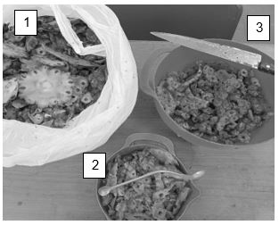 En las Figuras 3 y 4 se observa el proceso de cómo se recibió la muestra, su selección identificando la más sana, luego se retiró el exceso de fruta adherida a la cascara por medio de una cucharilla metálica, quedando lista para la caracterización.