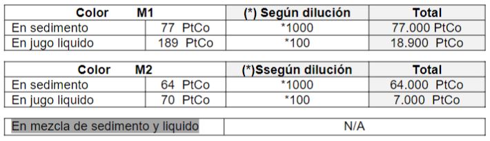 Para realizar el análisis de color de las muestras fue necesario realizar diluciones ya que el jugo se encontraba en una concentración muy alta pasando el rango de lectura del colorímetro, por lo tanto, se realizaron iniciando con 10ml de agua destilada, si seguía siendo +++, se pasaba a 100ml, si seguía siendo indetectable se diluía en 1000ml. Al final el resultado se multiplicó por la dilución realizada. En la tabla 7 se pueden observar los resultados obtenidos.