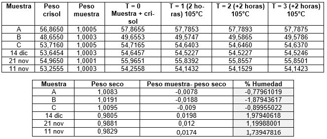 Para realizar la medición, se pesó el crisol previamente seco en horno, se taró la balanza analítica y se pesó la muestra inicial luego se introdujo el crisol con la muestra en el horno a 105ºC, a las 2 horas se retiró del horno se pasó por desecador y se pesó nuevamente, se registraron los datos y se repitió el proceso 2 veces más, los resultados se pueden observar en la tabla 8.