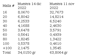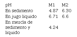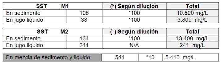 El sedimento que se formó en el fondo mostraba una apariencia arenosa, y se evidencia en los resultados con la alta concentración de estos. En la tabla 4 se muestran los resultados obtenidos.