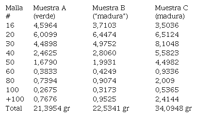 En la tabla 10 se registraron los resultados del proceso de tamizaje de la cáscara triturada, sin exprimir, seca a la intemperie y finalmente molida.