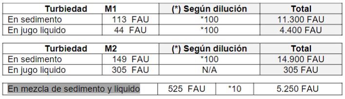 Para realizar el análisis de turbiedad de las muestras fue necesario realizar diluciones ya que el jugo se encontraba en una concentración muy alta, pasando el rango de lectura del colorímetro, por lo tanto, se realizaron iniciando con 10ml si seguía siendo +++, se pasaba a 100ml. Los resultados se muestran en la tabla 3.
