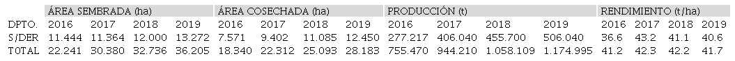 En la tabla 1 se evidencia los datos de la producción existente en Colombia de aproximadamente 32.700 hectáreas sembradas de piña con las variedades Perolera, MD2 (Oro Miel), Manzana, Cayena lisa [3].
