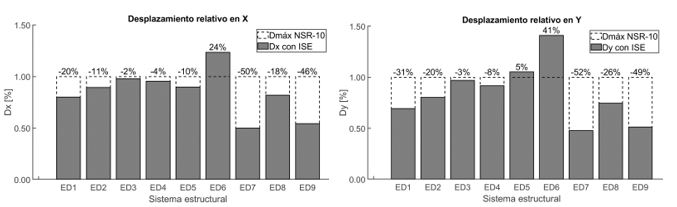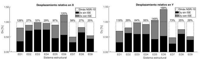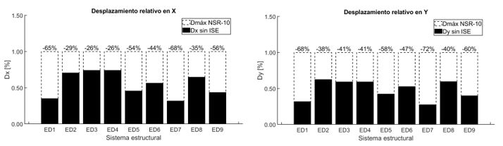 Al incluir la ISE bajo la metodología de Winkler, se observó en la ¡Error! No se encuentra el origen de la referencia. que, aunque los sistemas estructurales controlaron el desplazamiento relativo durante el análisis de modelos de base fija y estuvieron por debajo del límite máximo establecido por la NSR-10 (1.0%), estos valores aumentaron. Sin embargo, esta condición solo se superó en los modelos más altos construidos sobre el perfil de suelo D (ED5 y ED6), como se presenta en otros estudios [44].