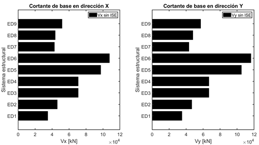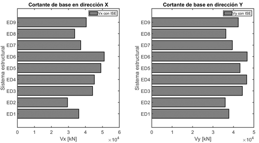 La respuesta del cortante basal está relacionada con la aceleración espectral obtenida del periodo fundamental, este parámetro es muy importante en la práctica del diseño sísmico. Al estar relacionado con el periodo, los modelos ED1 - ED9 presentados en la Figura 11, muestran nuevamente, que los sistemas ED5 - ED6 son más flexibles, ya que obtienen un cortante de base mucho mayor que los demás sistemas ED1 - ED4 y ED7 - ED9. En contraste, los sistemas más rígidos son aquellos con una altura inferior a los 15 pisos, es decir, el ED1 - ED2 (sobre perfil de suelo D) y el ED7 - ED8 (sobre perfil de suelo C).