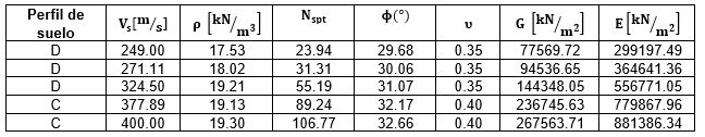 En la Tabla 4 se especifican las propiedades mecánicas de los suelos, las cuales se obtuvieron mediante las formulaciones anteriores. Estas propiedades son esenciales para llevar a cabo la implementación de la ISE en los modelos de base fija.