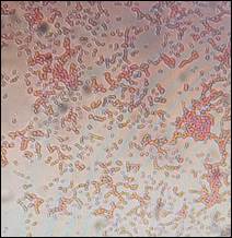 Para la siembra de los microorganismos, se utilizaron dos cepas certificadas, ATCC6538P para S. Aureus y ATCC25922 para E.coli, las cuales fueron dispuestas por el laboratorio de Microbiología de la Universidad Mariana. Previó a la siembra, se realizó un reconocimiento microscópico de cada una de las cepas, por medio de una tinción de gram, como se puede ver en las Figuras 1 y 2. Se encontró que E.coli se encuentra presente en forma de bacilos largos gram negativos, y S.aureus se encuentra en forma de cocos, de los cuales algunos forman parejas.