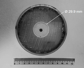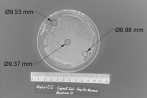 Posteriormente, con ayuda de una pinza metálica estéril, se adicionaron los discos de sensibilidad de celulosa (con el aceite esencial al 100%) en las placas Petri en 3 lugares, no menores de 15 mm del borde de la placa. Se colocaron las placas Petri (por triplicado) en la incubadora a 35°C por 24 horas.
