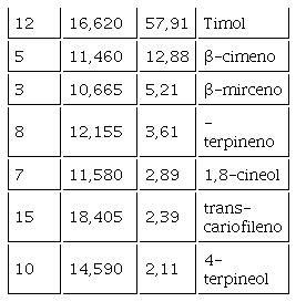 Con respecto a los compuestos activos mayoritarios, se encontró que, los resultados para el Orégano de monte (tabla 1) se pueden aproximar con los resultados encontrados por Stashenko y René-Martínez, (2010), quienes en su investigación comparativa de metabolitos secundarios volátiles encontraron timol (56%), ρ-cimeno (13%) y 1,8 cineol (9%) (Stashenko y René-Martínez,2010), de igual manera en el estudio realizado por Figueroa et al, (2013), se encuentra que la extracción se hizo por el método de arrastre con vapor, y que el compuestos mayoritario presente en el aceite de orégano de monte es el timol (83 %), seguido de ρ-cimeno (5,5 %), β-mirceno (3 %), γ-terpineno (2,5 %) (Figueroa, et al, 2013).