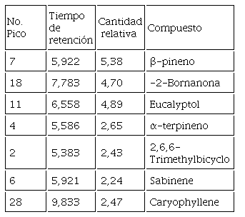 Asimismo, para Romero se puede observar en la Tabla 2, los componentes que se encuentran en mayor proporción en el aceite esencial, resaltando los compuestos que contribuyen en la formulación del desinfectante.