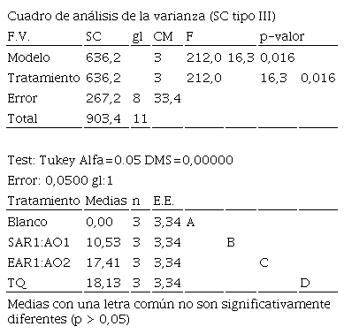 Posterior a esto se realizó la prueba tukey para identificar cómo se agrupan los tratamientos, los resultados obtenidos representan un comportamiento diferente para todos los tratamientos. El parámetro SAR1:AO1, representa la combinación realizada en partes iguales (1:1) de los dos aceites esenciales estudiados en la cepa S.aureus, por otro lado, el parámetro EAR1:AO2, representa la combinación realizada en relación 1:2 de los aceites esenciales en la cepa E.coli. De lo anterior se puede entender que la mejor formulación para el desarrollo del desinfectante a base de aceites esenciales se encuentra en el tratamiento para E.coli, el cual cuenta con una media en el porcentaje de inhibición del 17,41%.