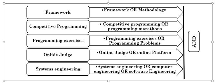 La cadena fue creada para establecer los criterios de búsqueda y con expresiones booleanas OR y AND, en la cual el operador OR se lo utilizo para añadir sinónimos del concepto de búsqueda, mientras que el operador AND, se hace la integración de las palabras relacionadas en la cadena de búsqueda como se muestra a continuación en la Figura 3.