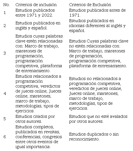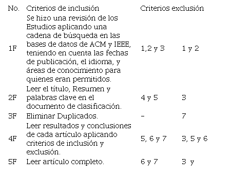 Para la búsqueda y construcción del mapeo sistemático de literatura del presente trabajo se realizó la definición de criterios Inclusión y Exclusión detallados en la Tabla 1.