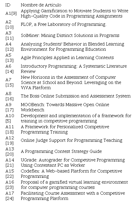 En la Tabla 3 se relaciona el listado de estudios seleccionados para el proceso de extracción de información sobre programación competitiva.