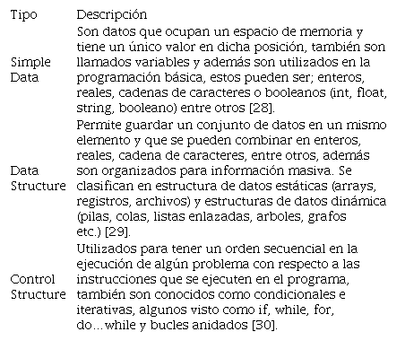 Para el aprendizaje en esta área de conocimiento se consideran los siguientes tipos de ejercicios: Datos Simples (Simple Data) [10]., Estructura de Control (Control Structure) [5],[18],[20]. Estructuras de datos (Data Structure) [5],[10],[18], Búsqueda Completa (Complete Search) [10],[18], Divide y Vencerás (Divide & Conquer) [18],[20], Técnicas Codiciosas (Greedy) [18],[20], Programación Dinámica (Dynamic Programming) [18],[20], Grafos (Graph) [5],[18],[20], Problemas Matemáticos (Problems Mathematics) [5],[18],[20], Geometría computacional (Computacional Geometry) [18],[20], Procesamiento de Cadenas (String Processing) [5],[18],[20] y Temas avanzados (Some Harder Problems) [18],[20] información sobre programación competitiva . La descripción de cada uno de los tipos de ejercicios se puede visualizar en la Tabla 3.