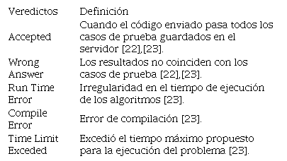 Los veredictos en programación competitiva son el sistema de juzgamiento de los programas enviados por los participantes [9]. El juez online evalúa cada ejercicio e indica el resultado final. De acuerdo con los estudios seleccionados se encontraron los siguientes tipos de veredictos para la evaluación de desarrollo de los estudiantes, como lo indica la Tabla 4
