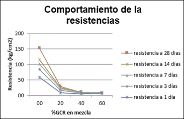 Como se evidencia en la gráfica de líneas donde se relaciona la resistencia obtenida (eje y), con la variable de proporción de agregado de GCR en mezcla (eje X), se observó una declinación prominente en la resistencia, inversamente proporcional a la proporción de CGR contenido para los diferentes días ensayados. El comportamiento de la relación entre la resistencia y las diferentes mezclas para cada día se puede apreciar en la siguiente gráfica 1.