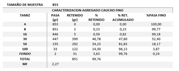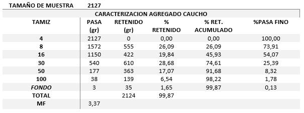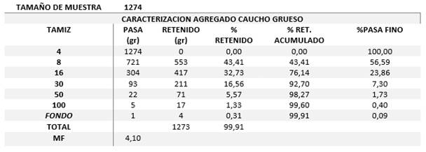 Las cantidades producidas por la planta variaron en tamaño y cantidad, debido a esto, se optó por combinar los gránulos para obtener una cantidad adecuada para llevar a cabo los diseños de mezcla, dando como resultado un material con las características granulométricas que se muestran a continuación en la tabla N°3, donde se observó que el concreto final ha tendido a ser más fuerte que el concreto normal, debido a que las partículas de caucho que tiene dentro le han permitido doblarse bajo la presión en vez de romperse.