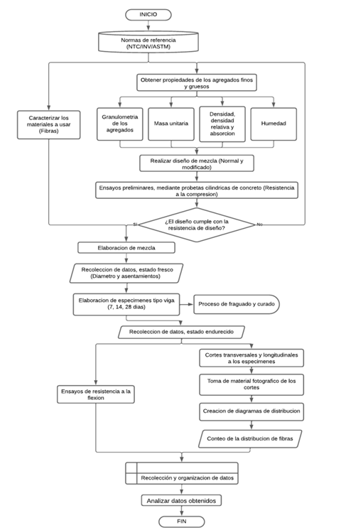 Para el desarrollo del proyecto fue necesario hacer diferentes ensayos de laboratorio que permitan obtener los resultados necesarios y así determinar cuál fue el comportamiento de las fibras. Estos ensayos corresponden al análisis de la resistencia a flexión, en estado endurecido. Los ensayos en laboratorio son una excelente herramienta para obtener información clara sobre los efectos que se generan al realizar los procesos (distribución/implementación de fibras) y de esta manera poder realizar un análisis más detallado a los datos correspondientes para saber cómo se modifican las capacidades mecánicas y categorizar el desempeño en laboratorio. Para que el proceso a realizar en laboratorio sea el adecuado y dotar de mayor fiabilidad los resultados, se toma en cuenta los ensayos que están descritos en la norma técnica colombiana que regulan la práctica de estos, como lo son: ensayos de resistencia a la compresión, método de ensayo para determinar la resistencia del concreto a la flexión y análisis de la manejabilidad del concreto, entre otros que se especificarán más adelante [14], [15], [16], [17], [18], [19], [20], [21] y referencias allí. La figura 1 muestra en detalle la metodología llevada en el proyecto para analizar la influencia de la distribución de fibras sobre la resisitencia a flexión del concreto autocompactante. A continuación, se describen las consideraciones, procedimientos y actividades que se llevan a cabo para el cumplimiento y desarrollo de los objetivos planteados para la investigación.