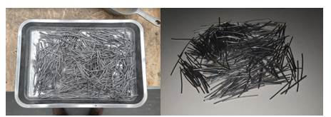 Las fibras que se emplearon como añadidura para la mezcla de concreto se seleccionaron en base al tipo de material del cual están fabricadas, para generar un punto de comparación entre sus propiedades físicas y mecánicas, y el desempeño a flexión. La elección de estos materiales se vio limitada por la baja oferta de este tipo de materiales en las ferreterías locales, incluso en medios digitales. Se limitó este estudio a fibras sintéticas y fibras de acero, como se muestra en la figura 2, para comparar la distribución de ellas en relación a las pruebas mencionadas. La fibra de acero que se empleó se obtiene de los cortes realizados al alambre galvanizado, procurando que las fibras obtenidas sean alargadas y cilíndricas como sus contrapartes comerciales; el diámetro propuesto es 1 mm y su longitud es de 4 cm, esto debido a que no había existencia de estas en el mercado local. La cantidad que se empleó fue basada en fichas técnicas de las fibras de acero utilizadas comercialmente, con una densidad de 20 . Dado al tamaño que presentan las fibras, tienen una fácil manejabilidad, trabajabilidad y aplicación a la mezcla de concreto, la cual no requiere de actividades previas o posteriores a su empleamiento, además, que la dosificación es fácil de aplicar sin afectar a los demás materiales de la mezcla.