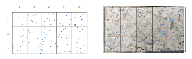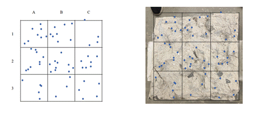 Con los especímenes fracturados, ya sea en forma transversal o longitudinal se procede a realizar un análisis de distribución de las fibras (Ver figura 1) con ayuda de material fotográfico (Ver figura 3). En las imágenes de las secciones a analizar de cada una de las vigas se crea una cuadrícula 3x3, de 5 centímetros. En esta malla, la posición de las fibras se reemplaza por un punto el cual ayudará a obtener una mejor lectura del esquema de distribución y disposición que se nos presenta. Las fotografías y conteo se realizan tanto a los cortes transversales y longitudinales del elemento, para posteriormente realizar un tratamiento estadístico de la información.
