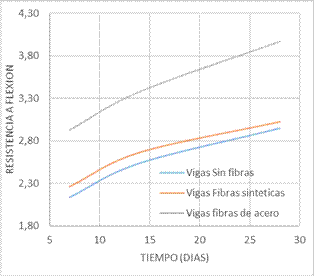 A partir de los ensayos realizados a las vigas en estado endurecido se obtuvo un cambio notorio en la resistencia a flexión de las vigas, como se muestra en la Figura 4. En esta figura se muestra la resistencia a flexión promedio en función de los días de curado de las vigas sin fibras (línea azul), vigas con fibras sintéticas (línea naranja) y vigas fibras de acero (línea gris). Ya que las vigas usan el mismo tipo de diseño de mezcla, se tiene un punto de comparación claro sobre las que tienen fibras. Se obtiene en general que mayor tiempo de días de curado, la resistencia aumenta en todos los tipos de vigas. Sin embargo, las vigas que cuentan con fibras sintéticas tuvieron un aumento mínimo de la resistencia a flexión y una alta resistencia a la fisuración, manteniendo unido los fragmentos posteriores a la falla del ensayo. Mientras que las que cuentan con fibras de acero presentaron mayor resistencia a flexión, pero esta no presentó una mayor resistencia a la ruptura, pues la presencia de las fibras era menor a la de las sintéticas. Además, las vigas con fibras sintéticas tienen una mejor dispersión a través de toda la viga, como se muestra en la columna de coeficiente de variación de la tabla 8. Lo que permitía que la viga se mantuviera más unida posterior al ensayo a flexión.