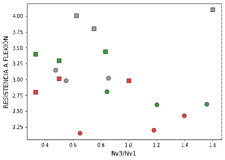 Sin embargo, se puede obtener en qué región de la viga se segregan las fibras, para ello se obtuvo la Figura 6. Esta figura muestra la resistencia a flexión como función de la razón del número de fibras en la parte superior de la viga en el corte transversal, sobre el número de fibras en la parte inferior (Nv3/Nv1). Si la razón es menor que uno, entonces significa que el número de fibras en la parte superior es mayor. Esta figura muestra que de los 18 especímenes realizados, 13 muestran que las fibras se segregaron para la parte superior de la viga. De los cuales, las vigas que se realizaron con fibras sintéticas están representadas con círculos y las que vigas que se elaboraron con fibras de acero se muestran con cuadros y los colores representan los diferentes días de curado, así para el rojo las vigas con 7 días, el verde las vigas para 14 días y el gris las vigas para 28 días. De la figura se puede inferir que las vigas con fibras que se segregaron en la parte superior presentan mayor resistencia a la flexión, esto se puede analizar desde el pandeo de las fibras y cómo las fuerzas actúan en los límites inferior y superior de la misma.