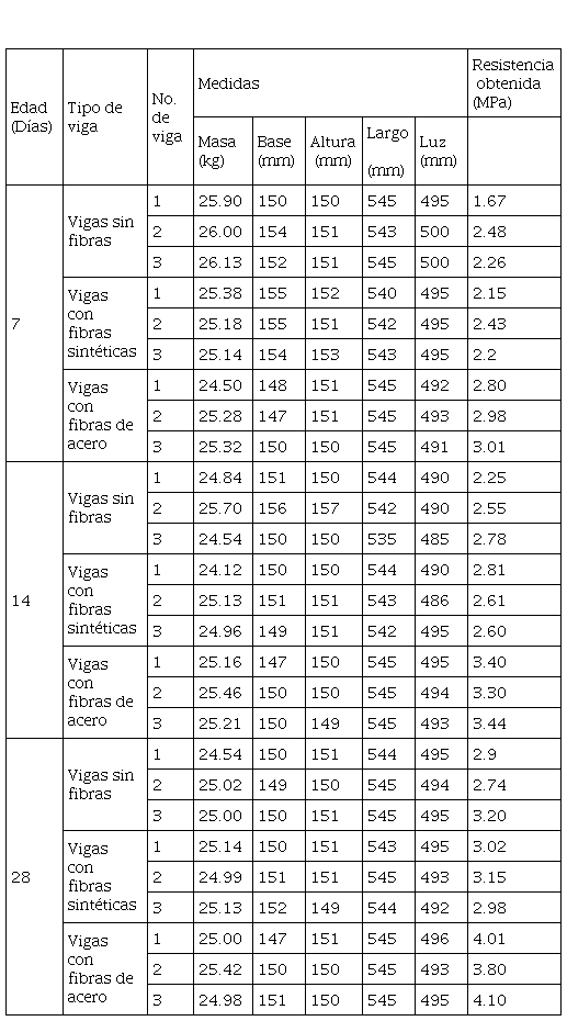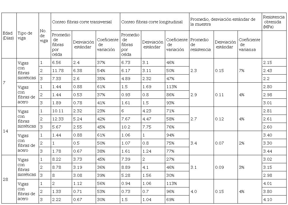 Las fibras tienen una distribución y disposición regular, según los datos de desviación y coeficiente de variación, dieron resultados altos, lo cual denota que las fibras estaban dispersas de una manera no homogénea, principalmente, en estos experimentos las fibras se segregan en la parte superior de las vigas. Las fibras de acero representan un aumento significativo en la resistencia a flexión y, de la misma manera que las fibras sintéticas, generan un aumento de la resistencia a la ruptura y fisuramiento.