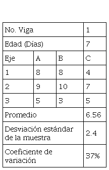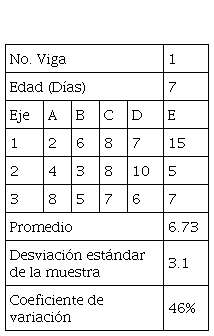 Las tablas 6 y 7 muestran la etiqueta de la viga, o número de viga, la edad de la viga y el número de fibras identificadas en cada uno de las celdas. Así, por ejemplo, en la tabla 7, en la celda correspondiente al eje 2, columna B, se encontró 3 fibras. Este ejercicio, se realizó para todas las vigas que se realizaron con la inclusión de fibras.