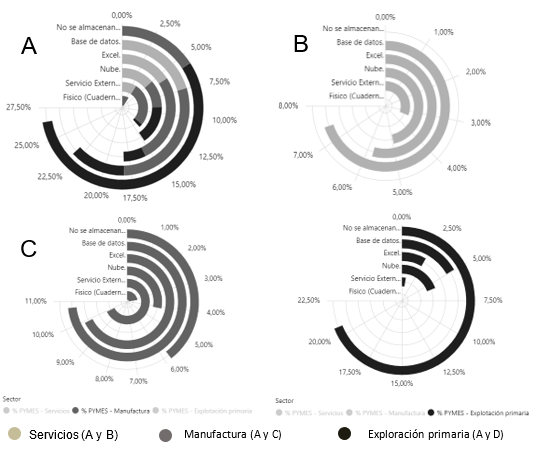 Esto es predominante en el sector de Explotación Primaria (Gráfica 8 - D), donde el 20,66% de las empresas manifiestan no almacenar datos. Aunque la nube y las bases de datos también son utilizadas por algunas empresas, con un 5,79% y 4,96% del total general respectivamente, estas opciones siguen siendo minoritarias. Excel y los servicios externos de almacenamiento son las alternativas menos populares en este sector. Por otra parte, en el sector de Manufactura (Gráfica 8 – C) las bases de datos son la opción más popular (10,74% del total general), seguidas de cerca por Excel y los servicios externos de almacenamiento (ambos con un 9,92%). Una pequeña proporción de empresas sigue utilizando métodos de almacenamiento físicos, como cuadernos (3,31%), mientras que la nube es utilizada por un 4,13% de las empresas. En el sector de Servicios (Gráfica 8 – B), las bases de datos son la opción predominante (7,44%), con Excel (5,79%) y la nube (4,96%) también como opciones comunes. Los servicios externos de almacenamiento son utilizados por un 3,31% de las empresas.