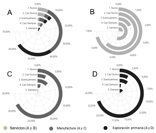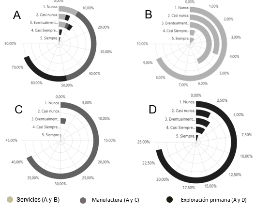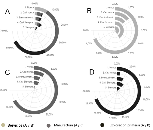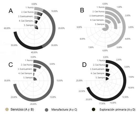De acuerdo con la Gráfica 10 – D, la mayoría de las PYMES de explotación primaria (28 de 42, equivalente al 23,14% del total) no utilizan el IoT en la comunicación de equipos y máquinas. Aun así, existe una minoría significativa (10 empresas, equivalentes al 8,26% del total) que utilizan IoT de manera constante o casi constante. Por otro lado, el sector manufactura (Gráfica 10 – C) tiene la mayor cantidad de empresas que nunca utilizan IoT en la comunicación entre equipos y máquinas, con 38 empresas (31,40% del total); Sin embargo, un pequeño número de estas empresas sí lo utilizan de manera casi constante o constante (6 empresas, equivalentes al 4,96% del total). En el sector servicios el uso de IoT es más diversificado (Gráfica 10 – B). Mientras que 10 empresas nunca lo utilizan (8,26% del total), existe un número igual de empresas que lo utilizan casi siempre o siempre (12 empresas, equivalentes al 9,92% del total).