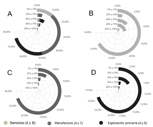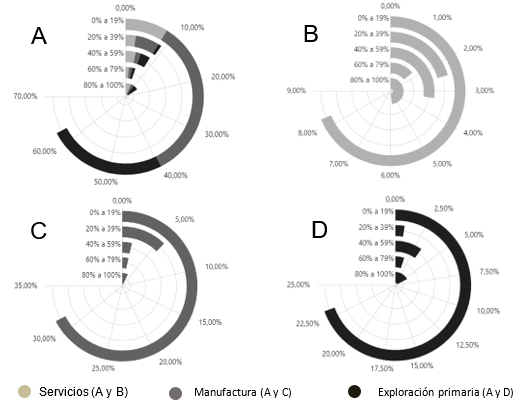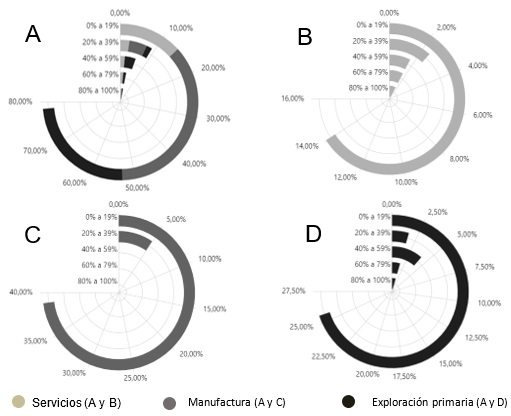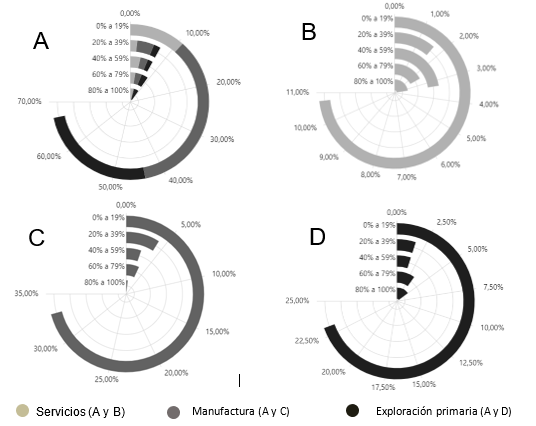 El sector de la manufactura es el dominante en la economía estudiada, con especial relevancia en la fabricación de aparatos y equipos electrónicos, seguido por la explotación primaria y el sector de servicios. La diversidad de subsectores y la presencia significativa de diferentes áreas de actividad reflejan una economía robusta con potencial para implementar herramientas de la Industria 4.0, lo que podría mejorar la eficiencia y competitividad de las empresas en los diversos sectores.